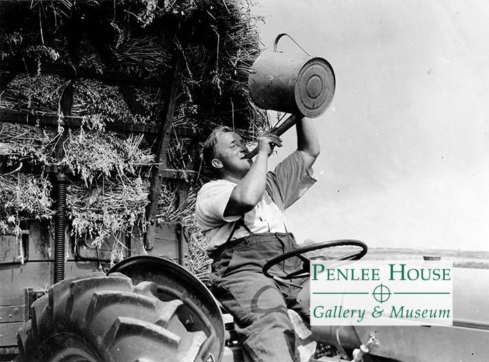 One of Penhaul’s ‘staged’ photographs, shows Dennis Thomas, sitting on a tractor drinking out of a watering can on a hot haymaking day.