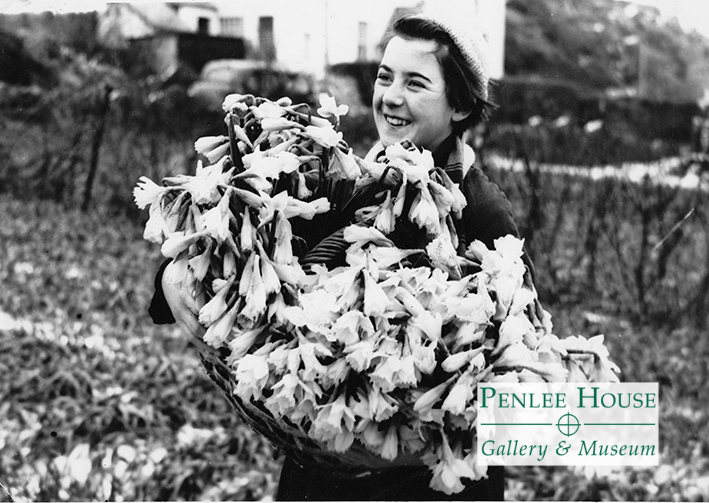 Mrs Ruth Wallis, nee Ruth Hosking Williams, holding a basket of newly cut daffodils. From Skewjack, near Sennen, Mrs Wallis later lived at Roskestal Farm, St Levan. In the 1950s and ’60s the daffodils were always picked in full bloom to send away. Nowadays they are harvested in bud.