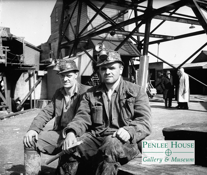 Miners Dickie Dodd and Joe Wall in front of Victory Shaft with its newly installed steel headgear and electric winder. In Douglas Williams’s book West Cornwall Camera this image is captioned “A typically robust study of two Geevor tin miners”