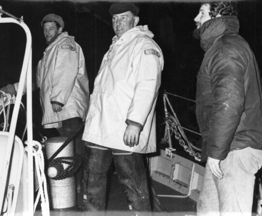 Having been contacted by the Coastguard, Coxswain Trevelyan Richards summoned the lifeboat’s volunteer crew and picked seven men to accompany him in the lifeboat. They were: Second Coxswain/Mechanic Stephen Madron, Assistant Mechanic Nigel Brockman, Emergency Mechanic John Blewett, crew-members Charlie
