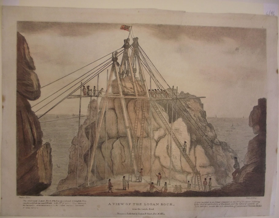 Description: A View of the Logan Rock, near the Land's End, engraving by Tonkin and Vibert. Part of a series of six engravings depicting the replacement of the dislodged stone.