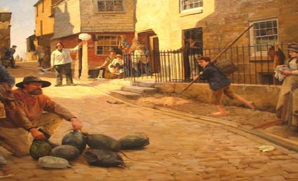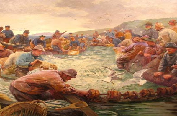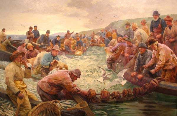 Brief Description: This painting shows a group of fishermen gathering a shoal of pilchards. It follows on from Craft's earlier work 'Hevva, Hevva', which depicts a huer shouting to the villagers that the pilchards have come into the bay. Everyone in the village would run down to the shore to help net the fish.