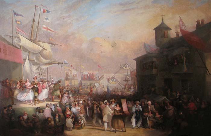 Brief Description: Quay Fair was held on Midsummers day, in the harbour area of Penzance near The Dolphin Inn. A hurdy-gurdy, an early street entertainment, can be seen in the foreground.