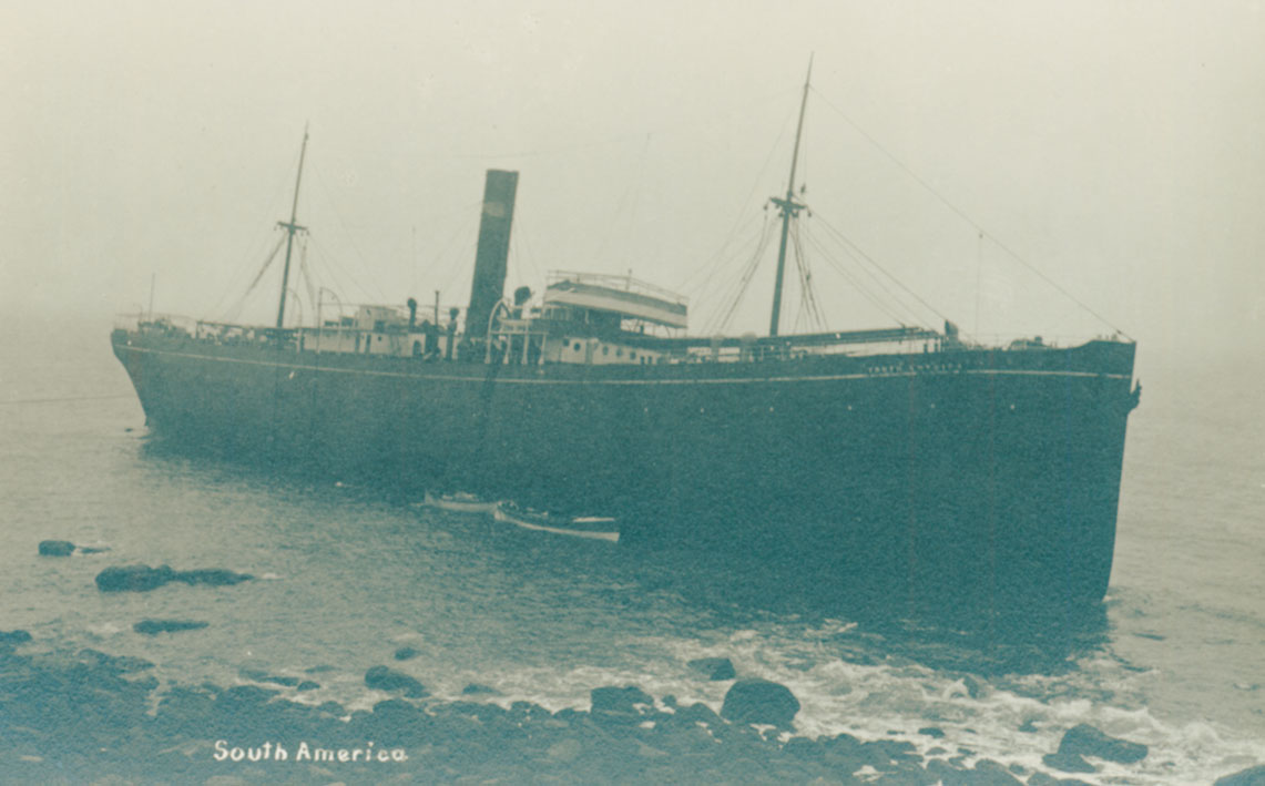Brief Description: The 'South America' was wrecked in St Loy Bay, west of Tater Dhu, between Porthcurno and Lamorna in thick weather on 13 March 1912. Her crew got ashore safely in their lifeboats, guided by local man John Richards. On the evening of 12 March she signalled the Lizard. Shortly afterwards there was poor visibility with drizzle and rain. In Mount's Bay she had to alter course to avoid pilchard drifters. She altered course too early and ran ashore. While the 'South America' was being broken up on 14 October 1912, the French steamer 'Abertay' ran aground alongside her in fog.