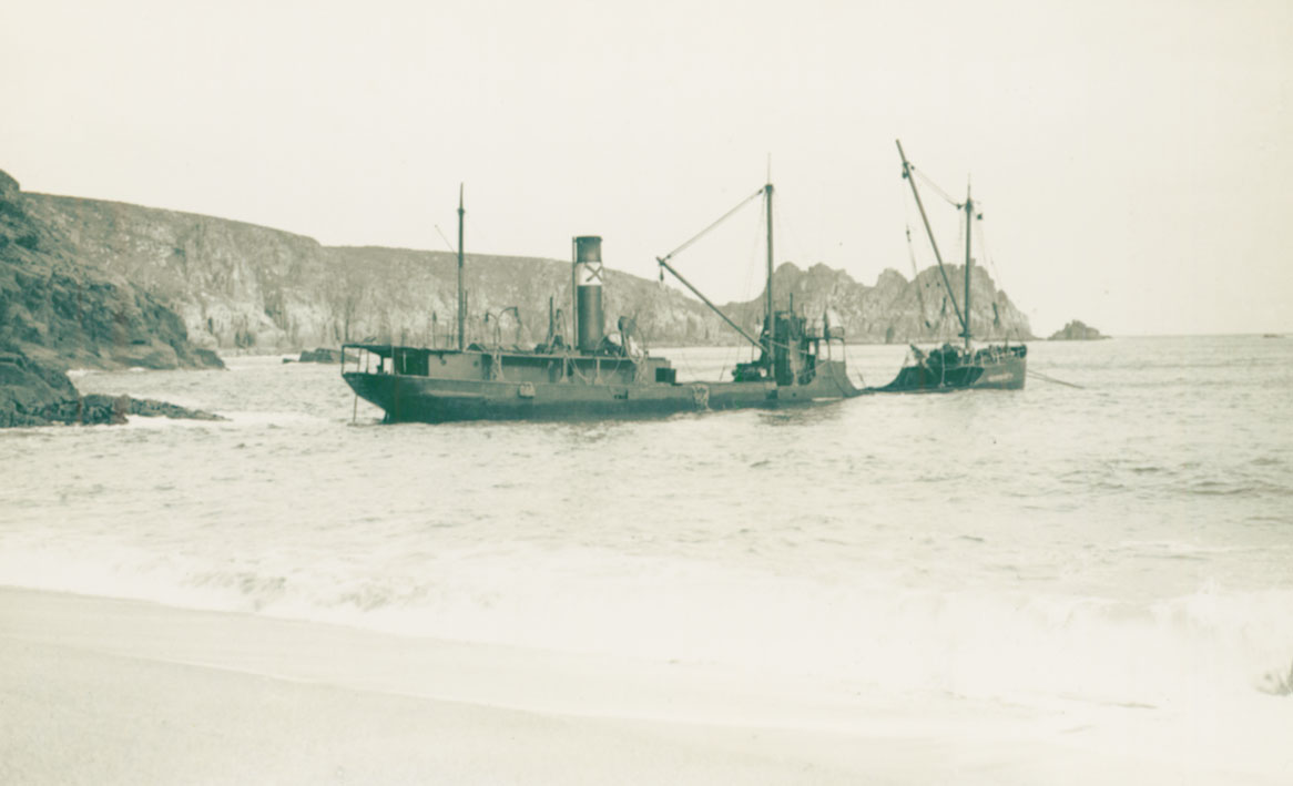 Brief Description: On 17 March 1919, the steam coaster 'Falmouth Castle' of Falmouth hit the Lee Ore Reef between the Runnelstone and Tol Pedn and beached in Porthcurno Bay.