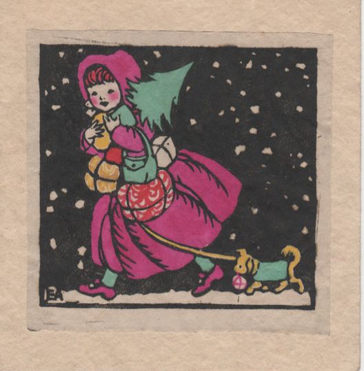 Brief Description: Christmas scene of girl carrying Christmas tree with dog on lead.