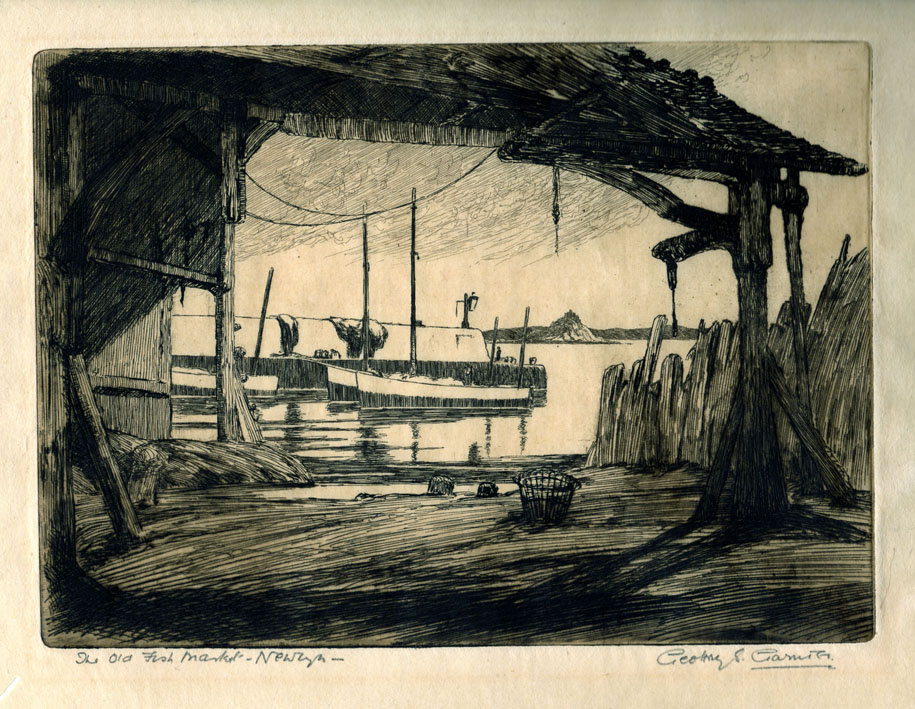 Brief Description: Etching showing a view through the fish market to the harbour wall, and beyond to St. Michael's Mount.