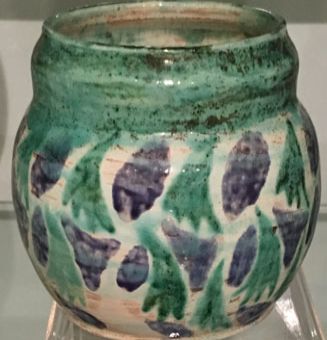 Brief Description: Enamel produced by Laura Knight and Ella Naper of two dancers. The male is dressed in blue and gold trousers and white shirt, the female in green and gold dress. Yellow background with squares and black flowers in a pattern. The enamel was made by Laura Knight and Ella Naper and was given to Charles and Ruth Simpson as a wedding present in 1912 by Laura and Harold Knight.