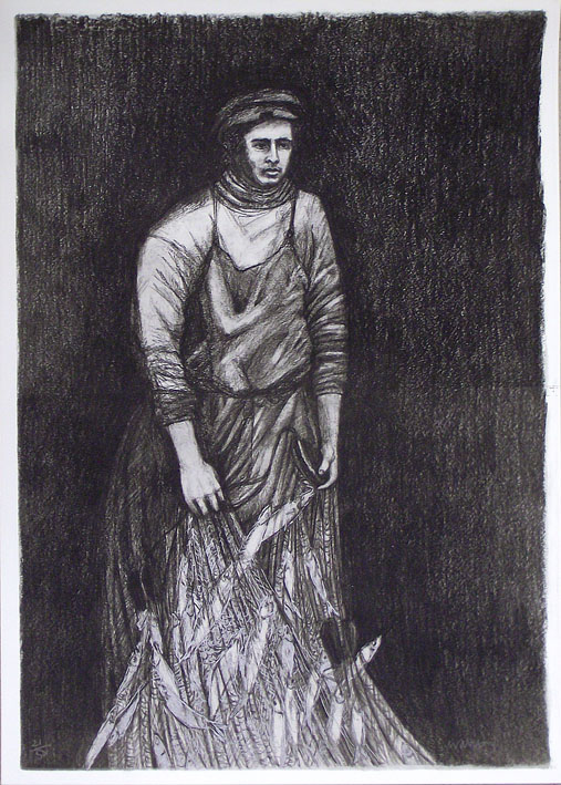 Brief Description: Part of a set of prints called 'The Fisherfolk Prints'. Lithographs taken from pencil drawings, based on period photographs by Harry Jenkins, a Lowestoft photographer.
