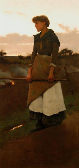 Brief Description: Study for 'Home From the Fields'. Portrait of the young woman, holding a rake horizontally in her hands, walking home along a path at dusk.