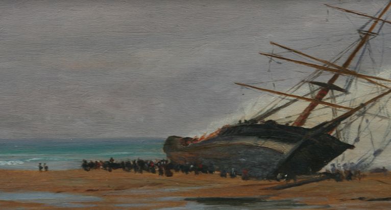 Brief Description: Burning ship on shore with crowd of onlookers gathered round.
