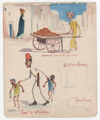 Brief Description: autograph book with black cover and gold embossed writing. Contains two sketches of Egyptian scenes by Harold Harvey.