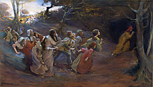 Brief Description: The Pied Piper leading a group of children off into the forest.