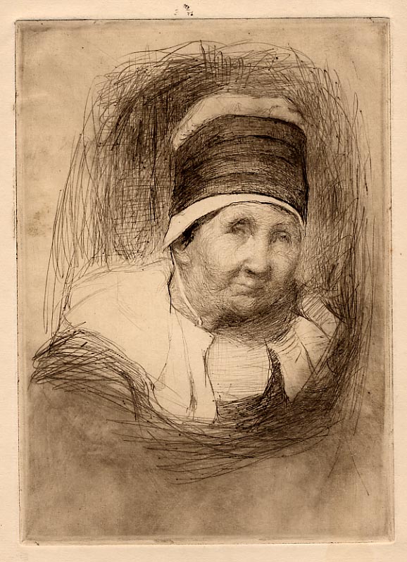 Brief Description: Drypoint etching head and shoulders portrait of an old woman in Breton headgear.