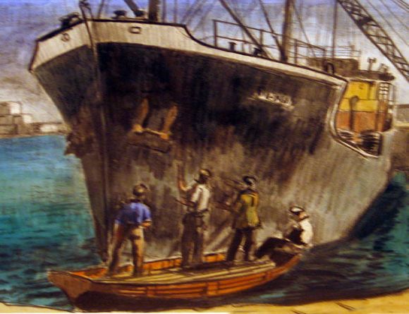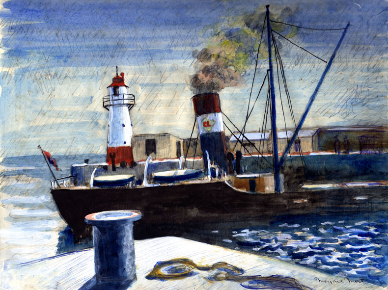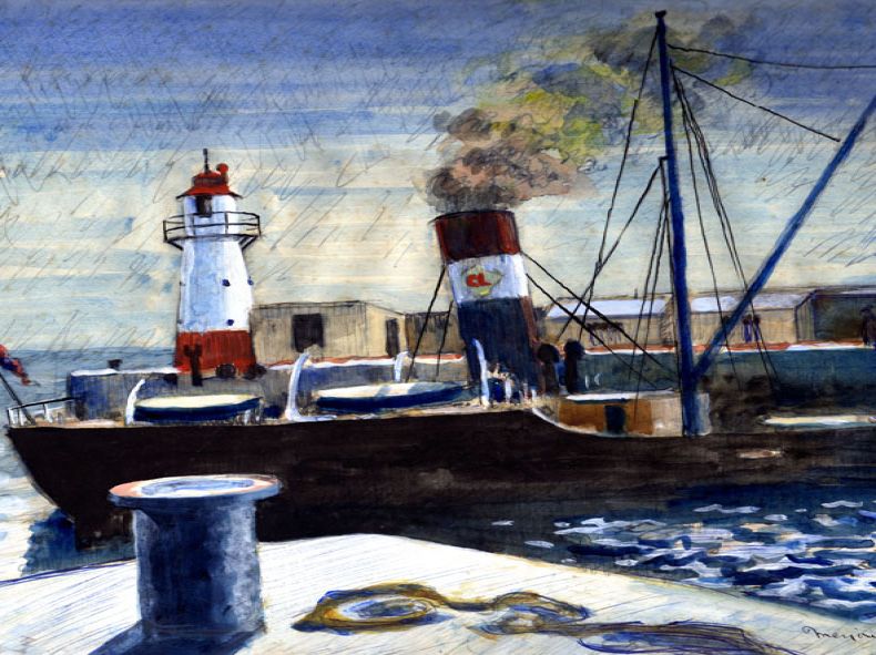 Cargo ship leaving Penzance harbour (untitled)