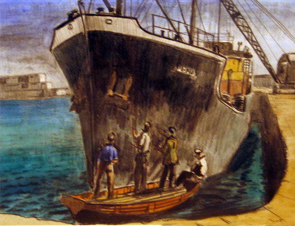 Cargo ship with four men in a dinghy at the bow (untitled)