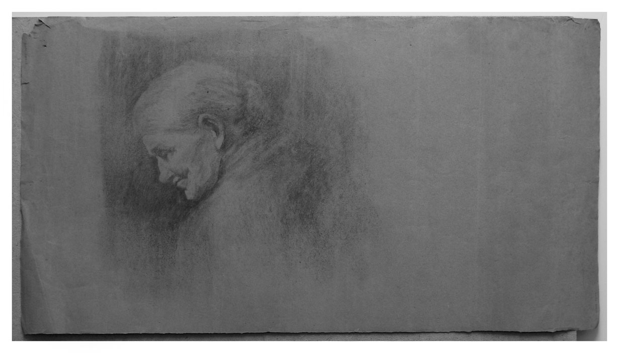 Brief Description: A full length charcoal drawing of a young nude woman, sitting on a cloth draped box with her back on view. Her forearms rest on her knees and there is light back shading. On the reverse side of the paper is a drawing of an elderly woman, looking to the left. She wears a bun in her hair and there is back shading. The paper used is of a darker shade and larger size than PEZPH : 2006.3-10.
