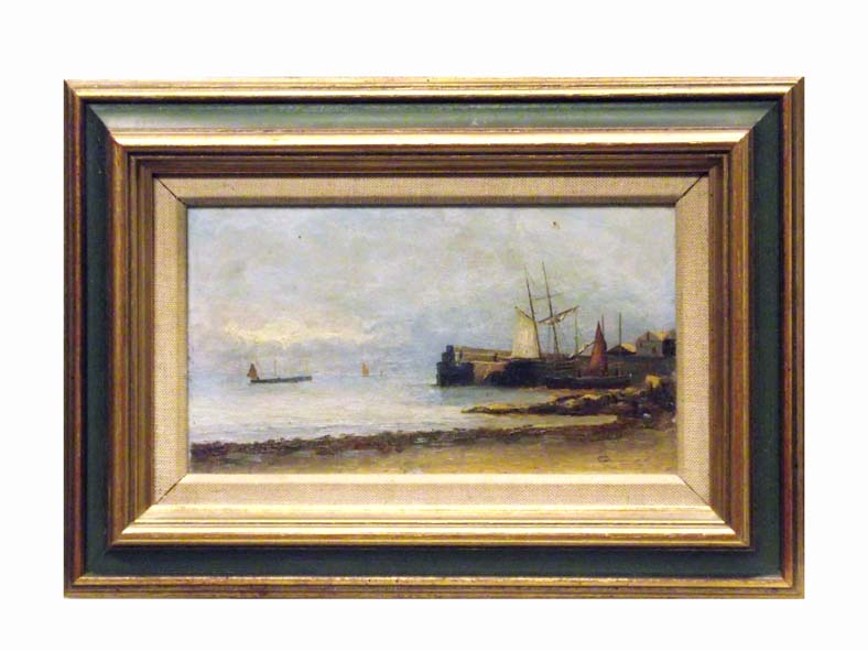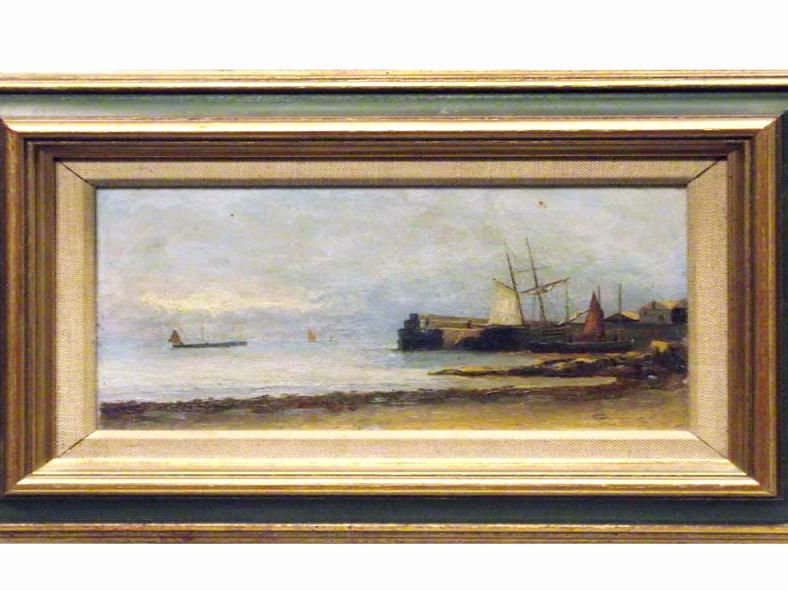 Brief Description: View towards old harbour wall with boats in harbour and sandy foreshore, initialled C.D.