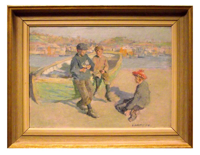 Brief Description: Three boys in foreground with green hulled boat, one holding a model boat, with harbour in the distance