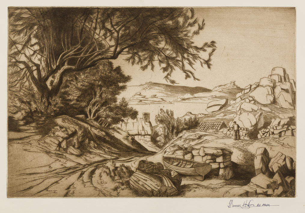 Brief Description: View of Tresco, on the Isles of Scilly, with two boats in foreground under pine tree with cottages and rocks.