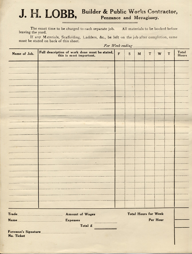 Brief Description: blank time sheet for J.H. Lobb Builder and Public Works Contractor, based in Penzance and Mevagissey