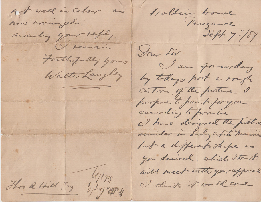 Brief Description: Handwritten letter to Thomas A Hill from Walter Langley forwarding a cartoon of the commission for a picture similar to Memories. Dated 7th September 1889. The cartoon is not enclosed. This letter accompanied the loan of the painting Absent Thoughts, PEZPH:2015.L2