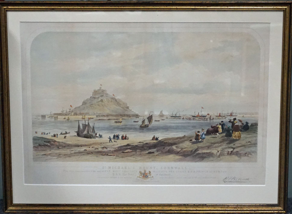 Brief Description: A small flotilla of boats escort Queen Victoria's paddle steamer towards St. Michael's Mount.