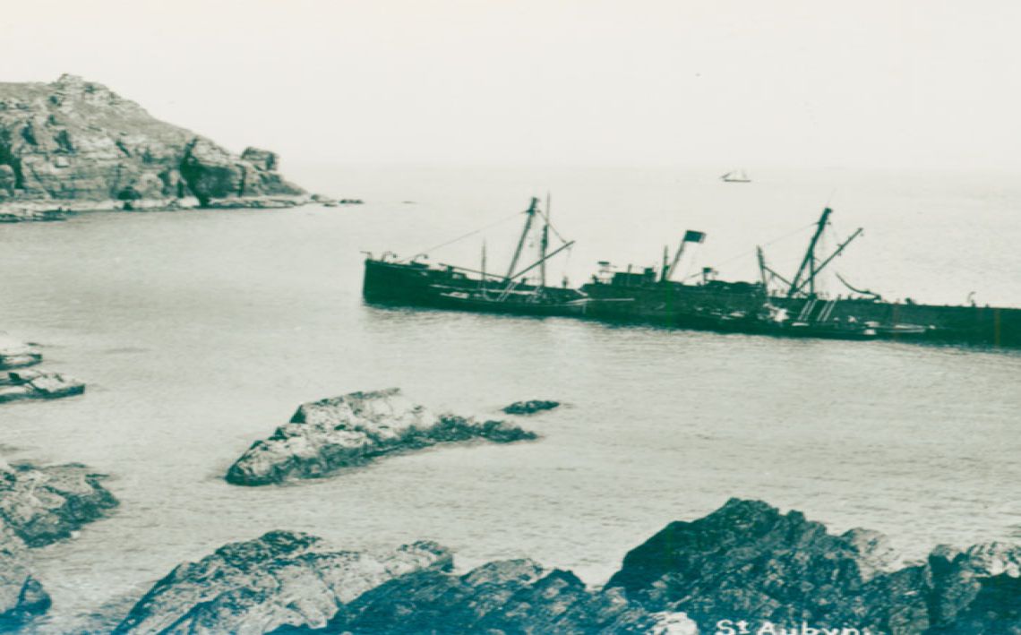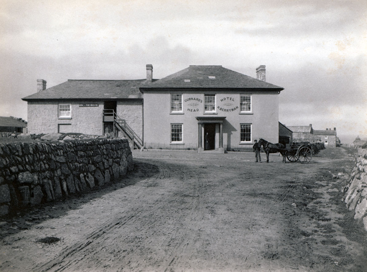Brief Description: A view of the Gurnard's Head Hotel from the unmade driveway. An unidentified man stands in the doorway and another man stands with a horse and cart facing the camera. The proprietor at the time was R. Berryman whose name appears on the outside of the building, which dates the image to 1919. Details from Pigot's 1823, 1830, 1844 and Kelly's 1873, 1883, 1893, and 1919; West Penwith Resources-Public Houses and Wikipedia. The Gurnard's Head appears to have traded as the Gurnard's Arms Hotel between 1873 and 1883. Thomas Eddy ran the Gurnard's Head Hotel between 1891 and 1893; Richard Berryman in 1919; Thomas Bater in 1963 and Roy and Joy Kell took over in 2000. The headland was popular with tourists during Queen Victoria's reign. The freehold of the Gurnard's Head Inn was put up for sale by auction on Thursday 27 May, 1880 at the Western Hotel, Penzance. The inn was part of the 'Nicholls Tenement" and also rights of common on Treen Cliff and 12 acres of fertile arable lands and improvable crofts and moors". The reserve price was £975 but the highest bid was £730. The property remained unsold.