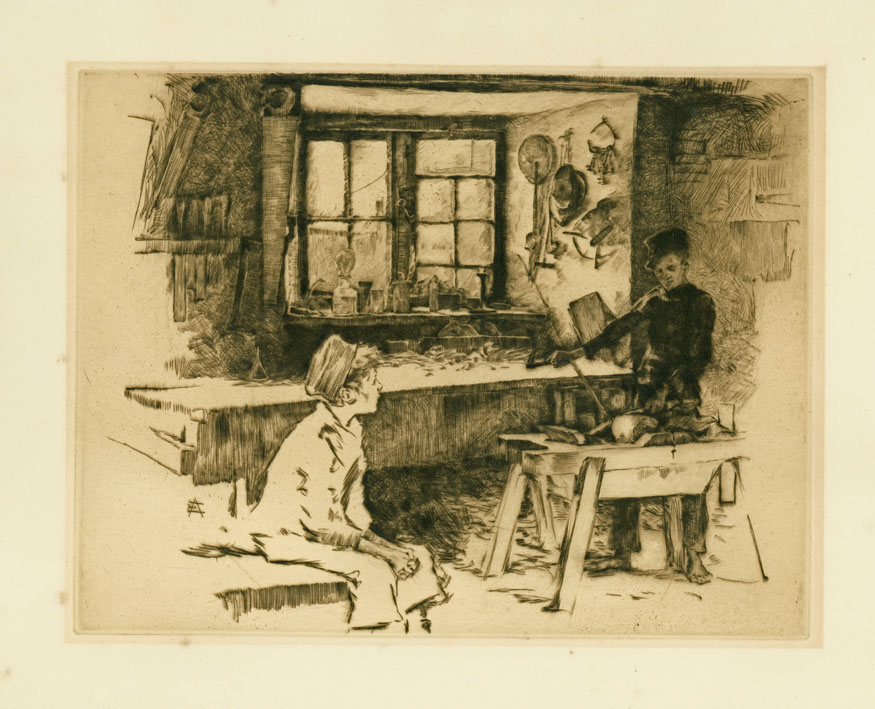 Brief Description: The carpenter's shop at Newlyn. A bench runs under the window, and by a smaller bench stands a youth with bare feet in a jersey and cap, another youth is seated in the left foreground.