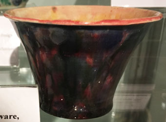 Brief Description: Lustreware pottery pot with mottled glaze in browns and orange