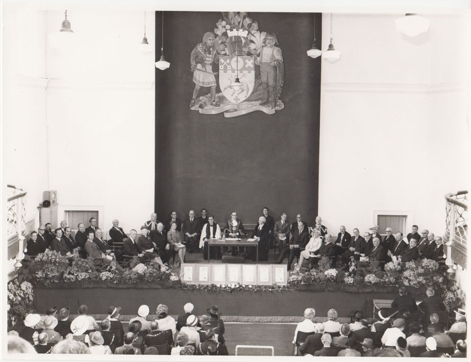 Brief Description: The Borough Council and Honorary Guests are sitting on the stage in St. John's Hall before a full audience
