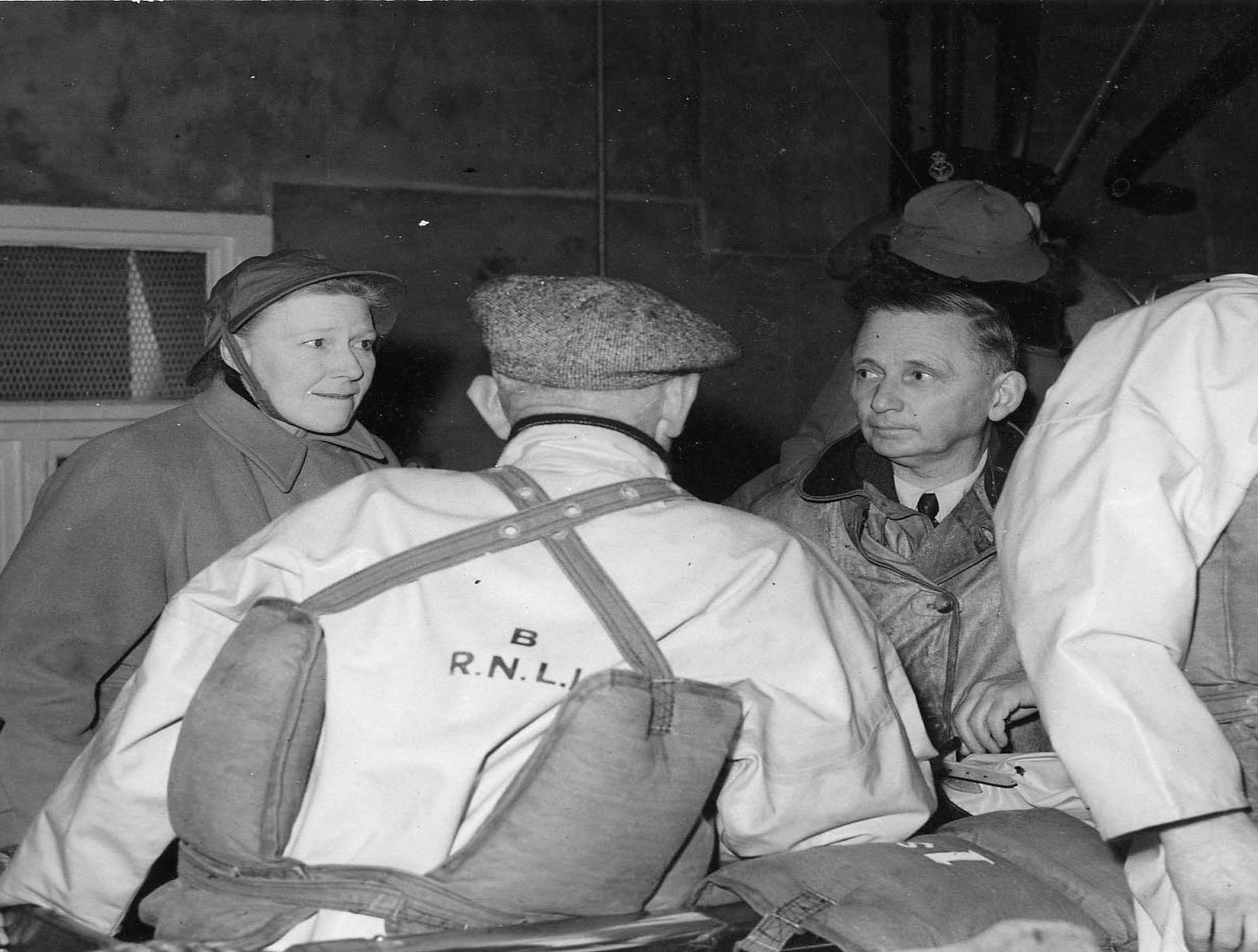 Crew of Penlee lifeboat talking to visitors in the boathouse