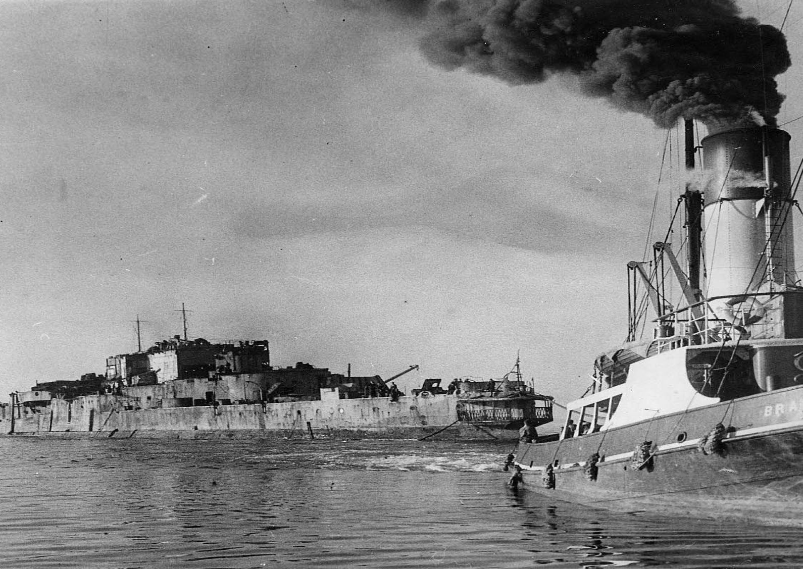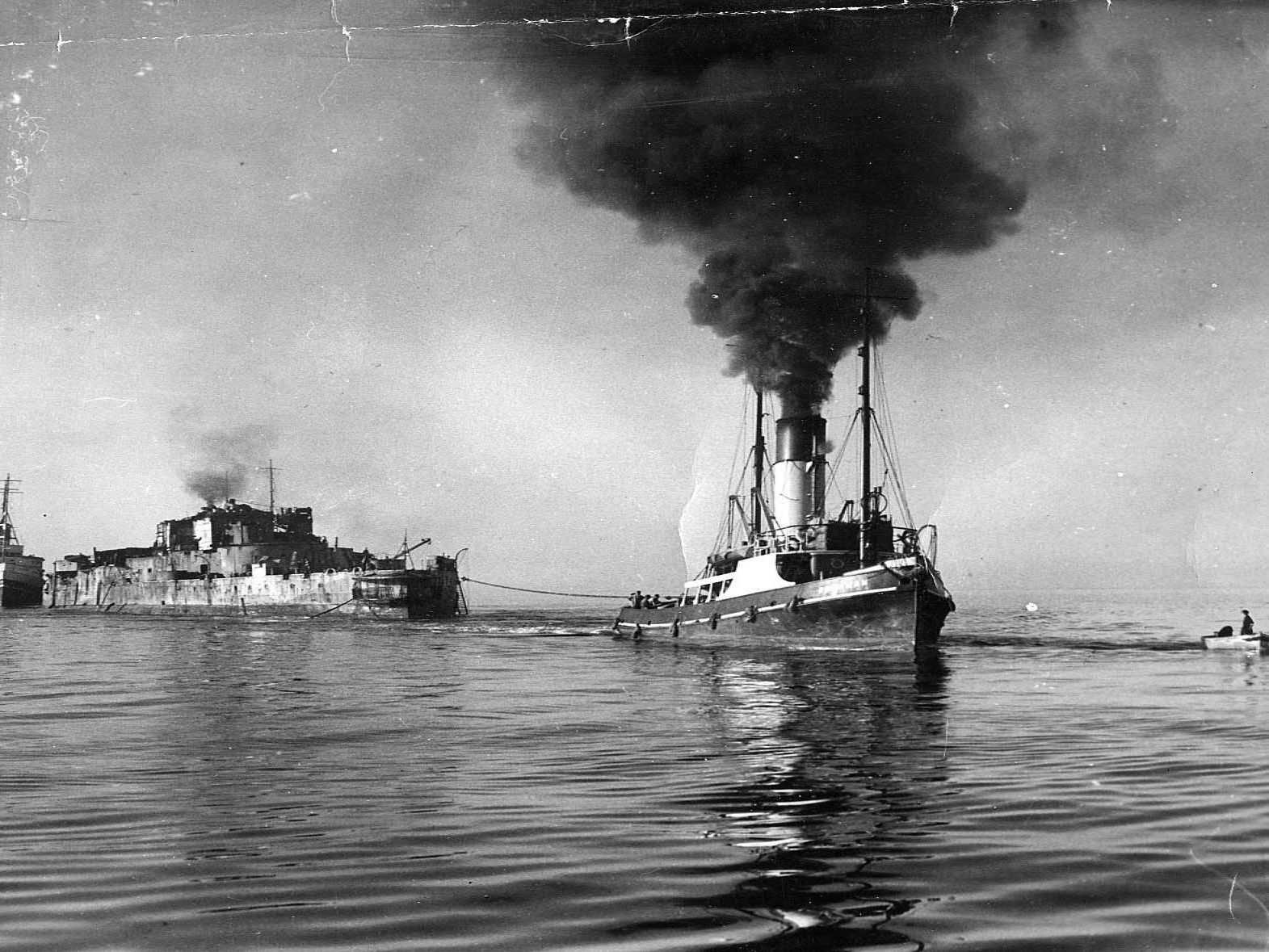 HMS Warspite being towed between Prussia Cove and Hogus Rocks. The tug boats are "Brahman" (front) and "Englishman"(rear).