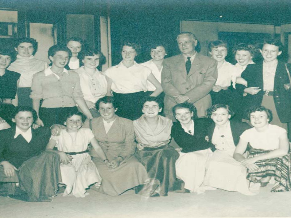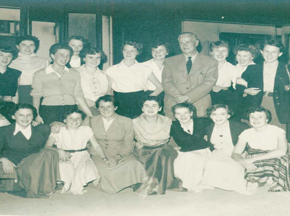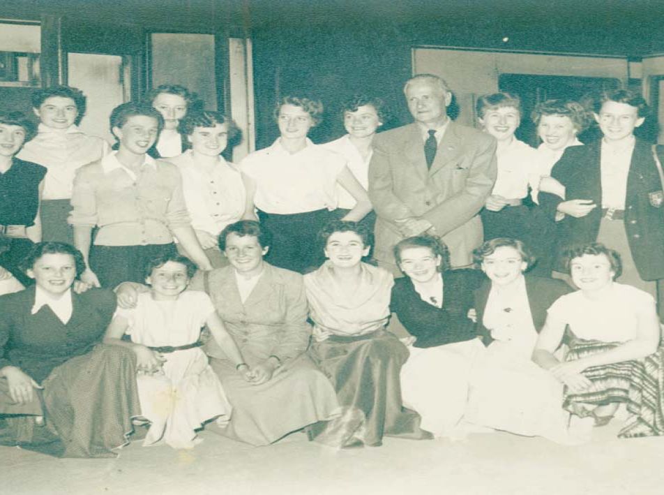 Mr Farrar, the Musical Director, poses with the Penzance Girls' Choir at Penzance Railway Station.