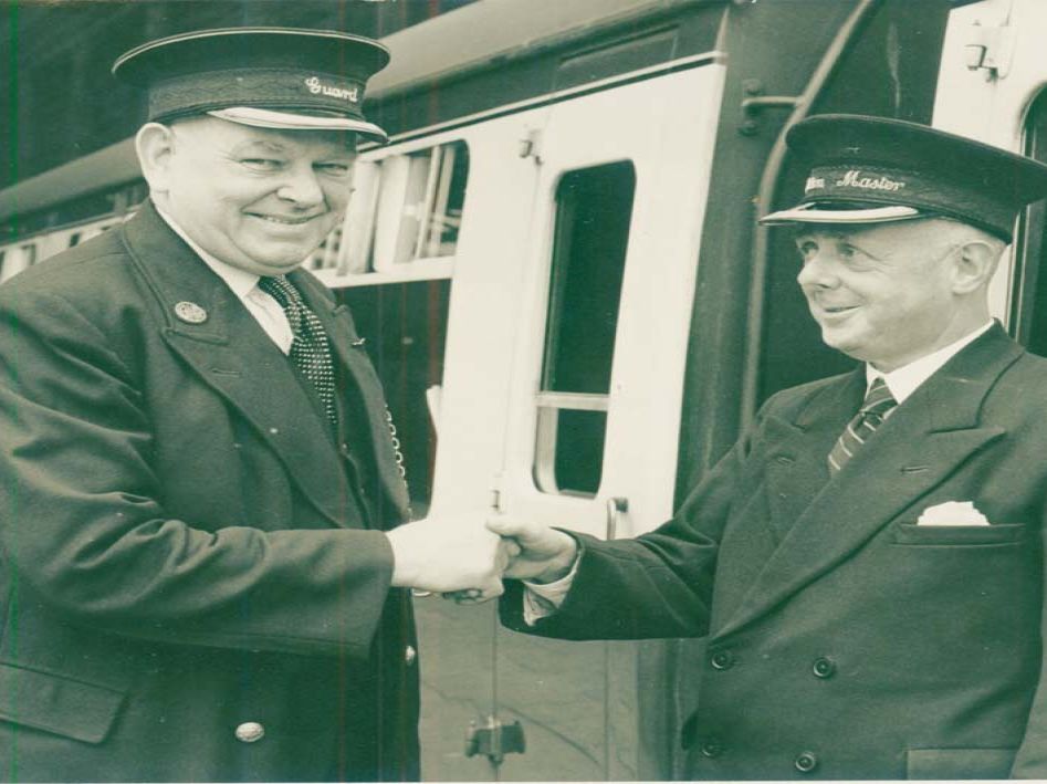 Mr Green, Station Master at Paddington, congratulates Guard Mr Trott of Penzance on his retirement