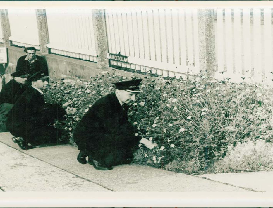 Railway staff tending the garden at Nancegollan Station.