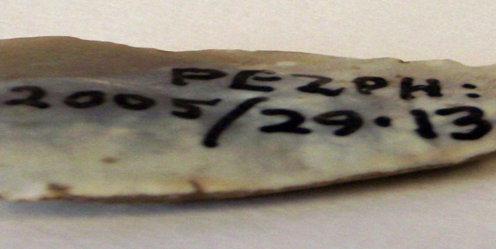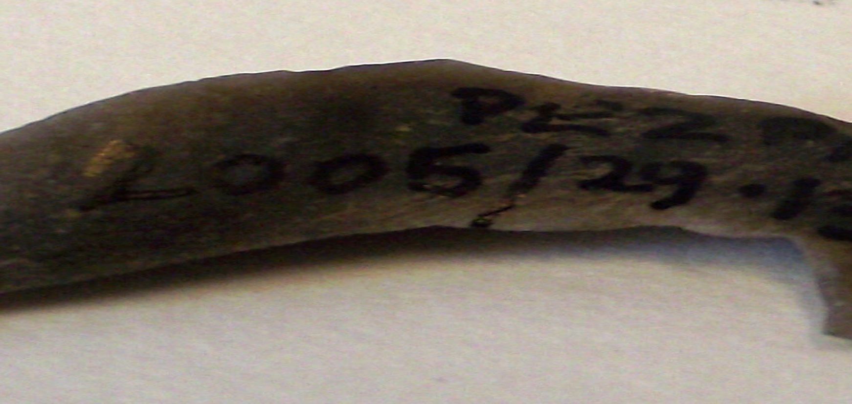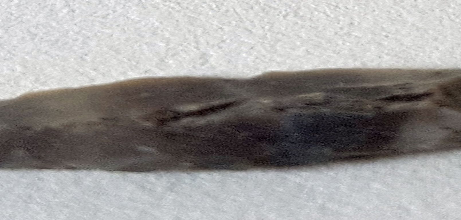 A hollow grey/pinked elongated blade-shaped piece of glass with smoothed surfaces.