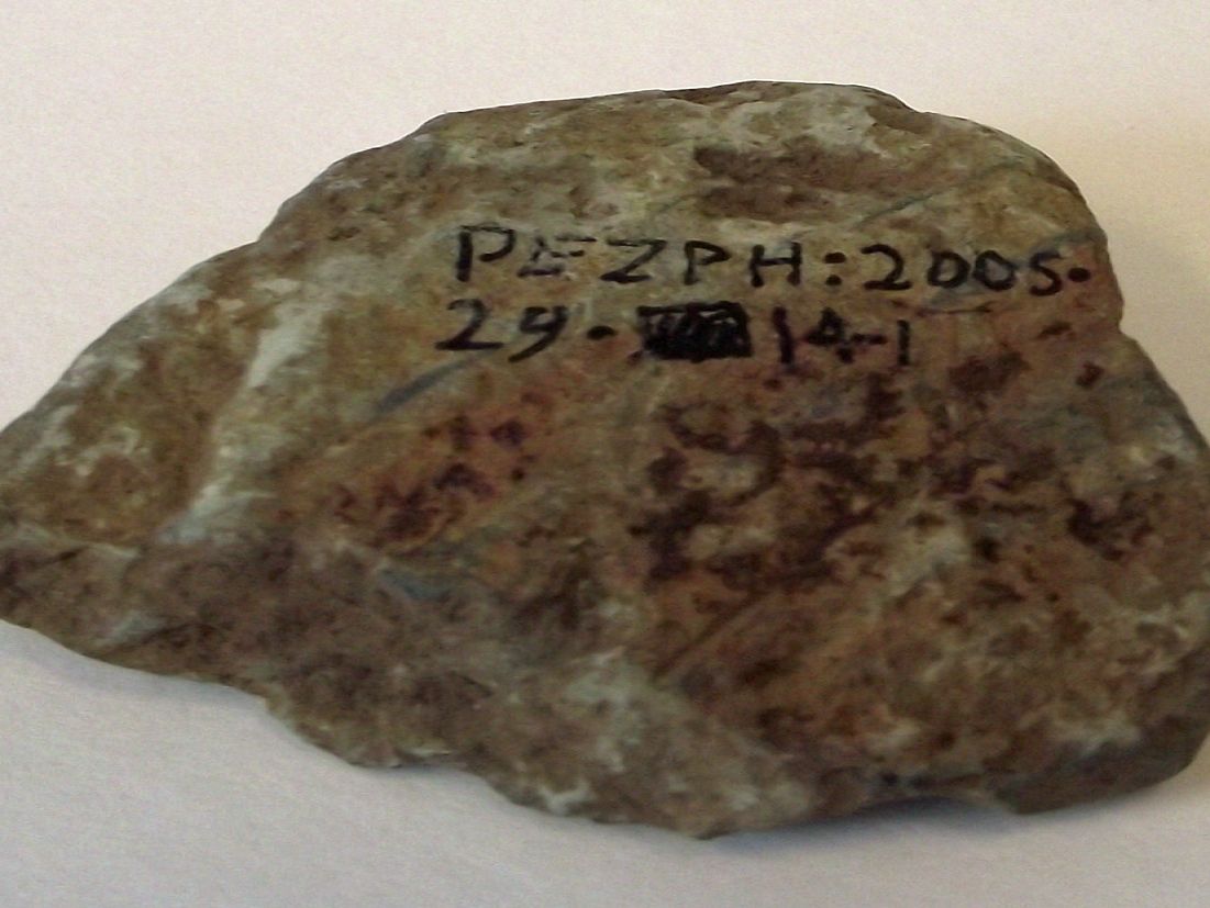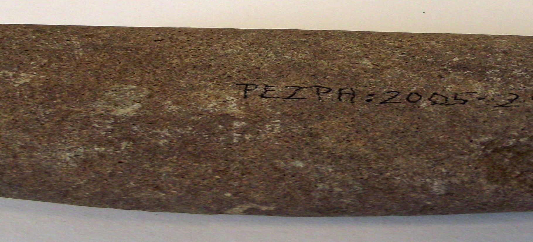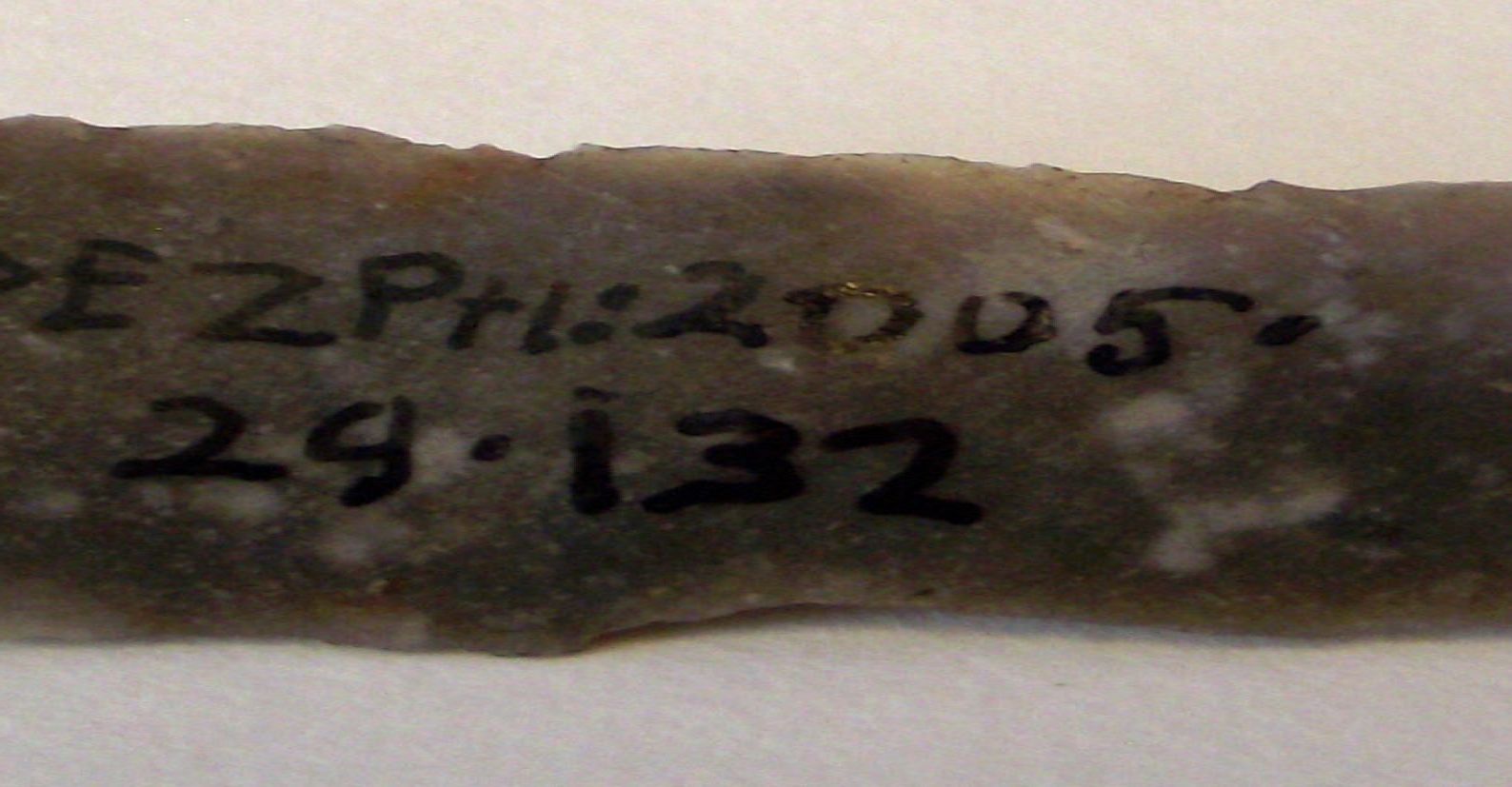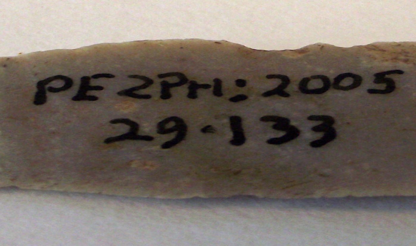 A hollow grey/pinked elongated blade-shaped piece of glass with smoothed surfaces.