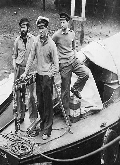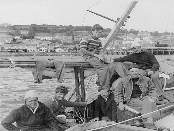 Three sailors posing aboard the sailing dinghy "Squall" at Smeaton's Pier, St Ives