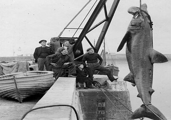 Giant basking shark being unloaded on North Pier, Newlyn