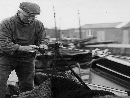Mr John Tonkin of St Ives, repairing nets on the 'Our John' in Newlyn harbour