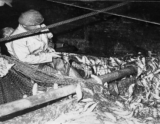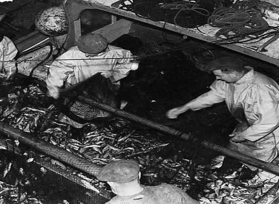 Two fishmen clearing the pilchards from the nets