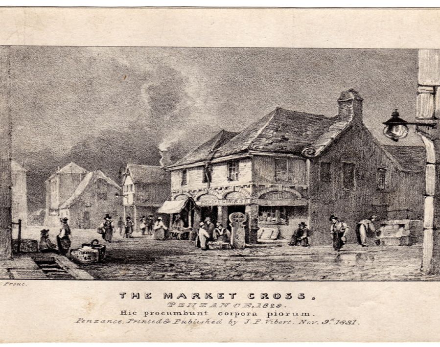 The Market Cross, Penzance, 1829. Hic procumbunt corpora piorum.