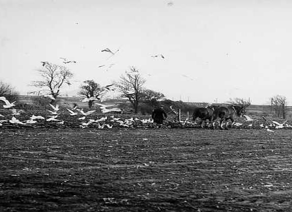 Seagulls following the horse drawn plough driven by Mr Dennis Stone.