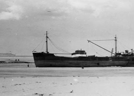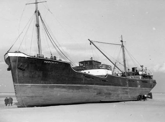 The coaster 'Serenity' laden with cement aground on Hayle Bar in January 1957. She was floated off safely.