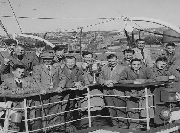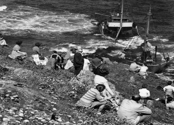 People viewing the wreck of the Traute Sarnow from the cliff at Gurnard's Head, July 1954