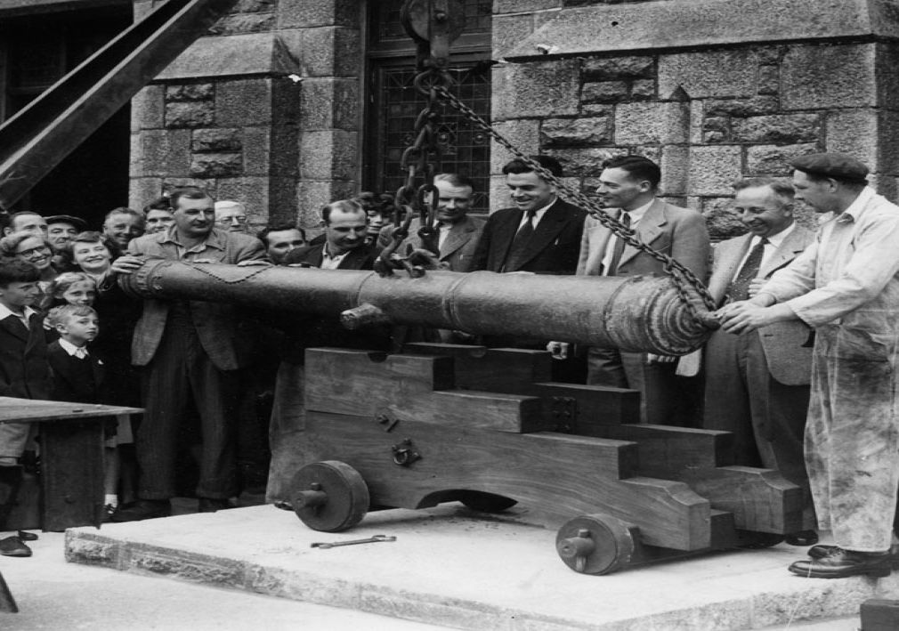 Lowering the cannon into place outside Penzance Library