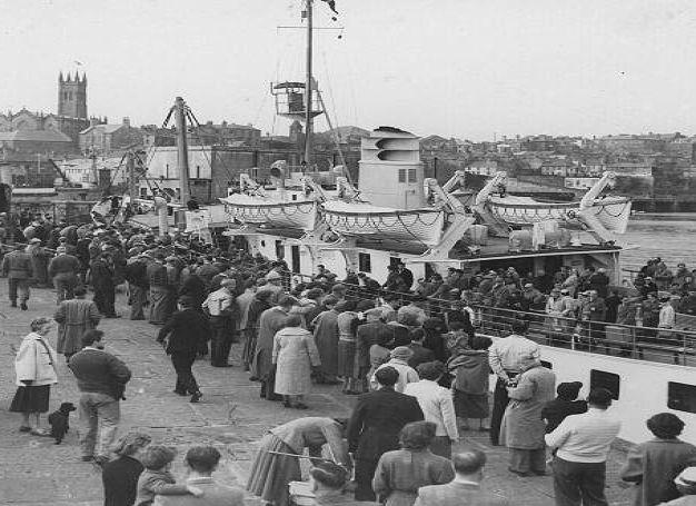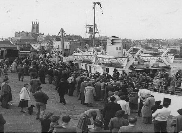 Spectators on the quay at Penzance are watching the Scillonian II being prepared for her maiden voyage to the Isles of Scilly on 17 November 1955. Many of these were Scillonians who made the special trip from Southampton to Penzance.