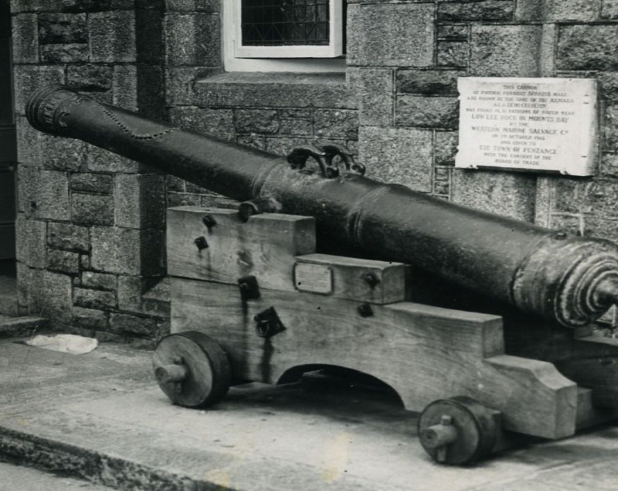 The cannon, the gun carriage and the explanatory plaque outside the School of Arts in Penzance