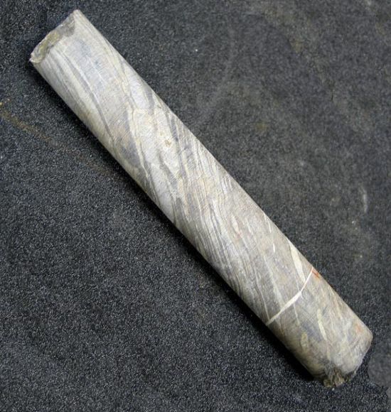 Drill core of killas, a Cornish mining term for metamorphic rock strata of sedimentary origin which were altered by heat from the intruded granites in the English counties of Devon and Cornwall.